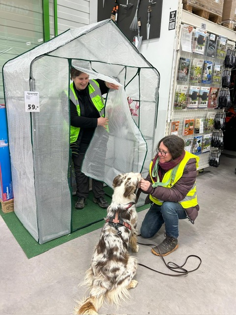 Für einige Hunde war es der allererste Indoor Trail im Globus Baumarkt in Rottenburg. Ganz schön aufregend, in den langen Gängen mit glattem Fußboden und vielen fremden Gerüchen nach der Versteckperson zu suchen. Vor allem, wenn sie hinter Türen, Paletten, Gabelstaplern, in Regalen oder Duschkabinen versteckt sind und auch noch Hundefutter auf Nasenhöhe ausliegt!
